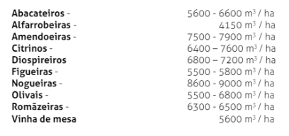 Verifica-se também que o seu consumo é inferior quando comparado com as amendoeiras e nogueiras, por exemplo. No caso dos citrinos os valores são bastante idênticos, tendo as duas culturas necessidades hídricas muito semelhantes.